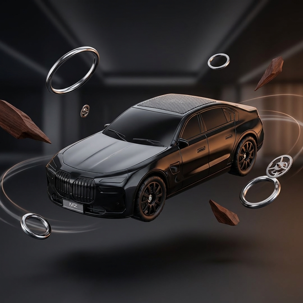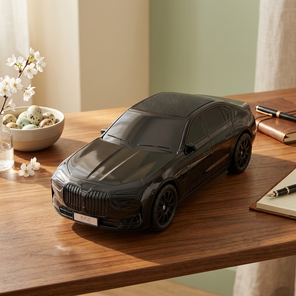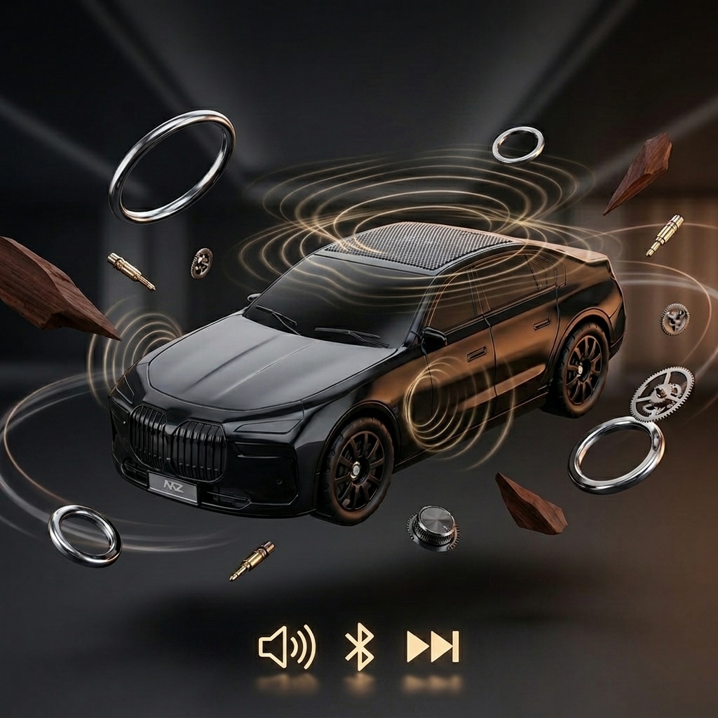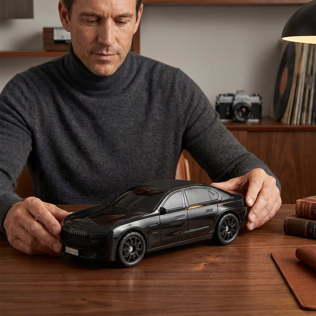 A scaled-down classic coupe with a punchy speaker hidden under the hood. A conversation piece that also plays Coltrane.