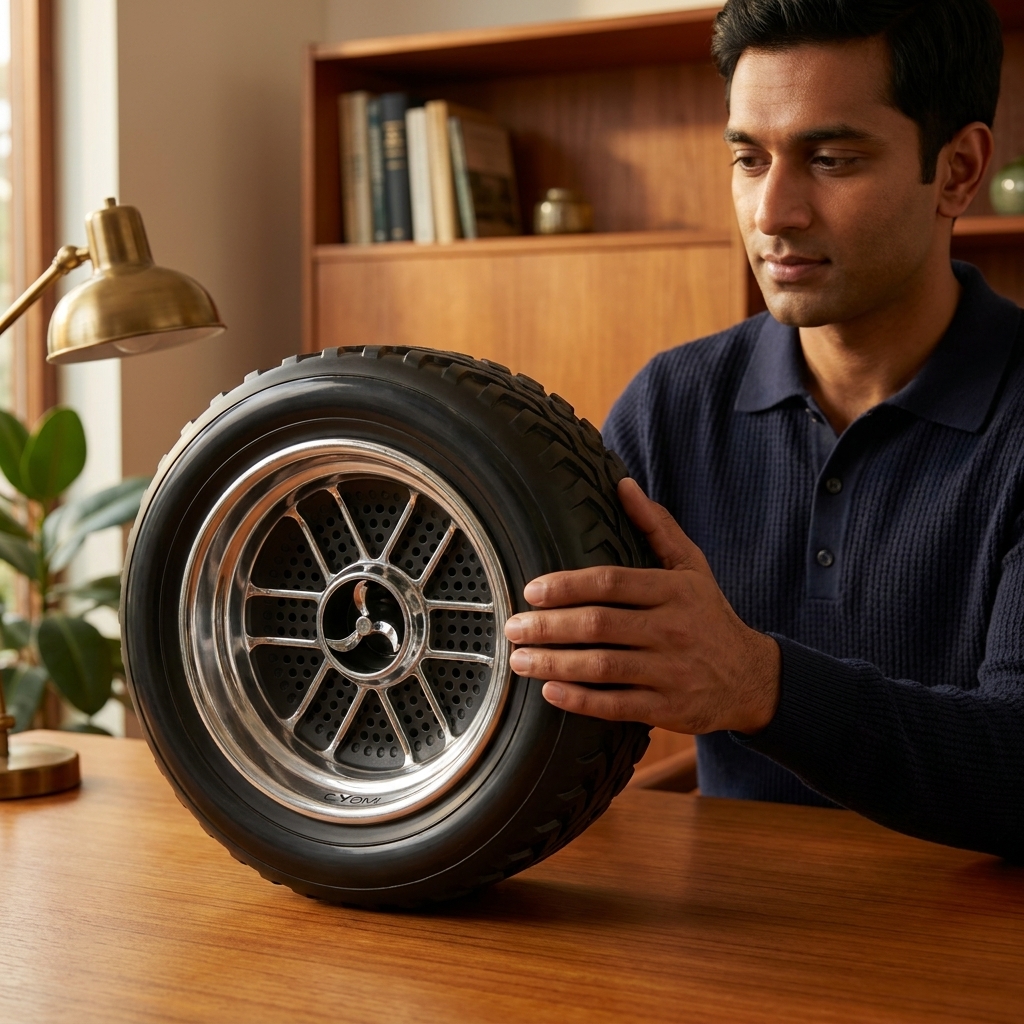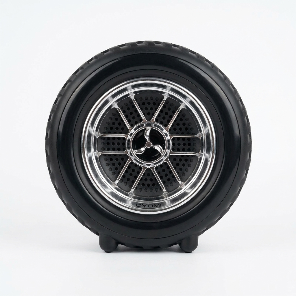 A tyre-shaped speaker that doubles as a desk object. Authentic tread, sidewall detail, surprising bass — and just enough rubbery menace to make your coffee cup vibrate.